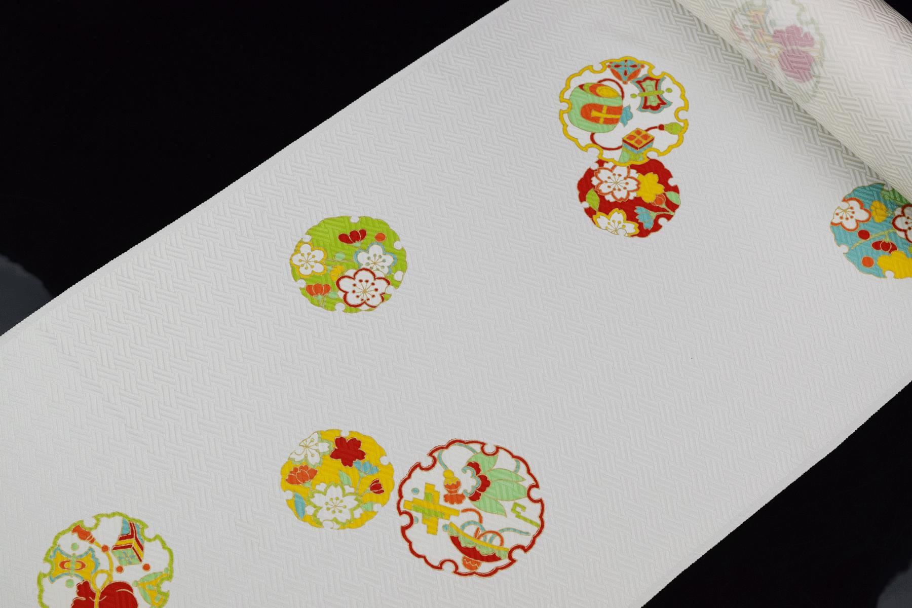 白地に、雪輪文様が映えるかわいい祝着。雪輪文様は、ふんわりとしたボタン雪を表現し、豪雪の年は、豊作となる事から五穀豊穣の吉祥文様です。