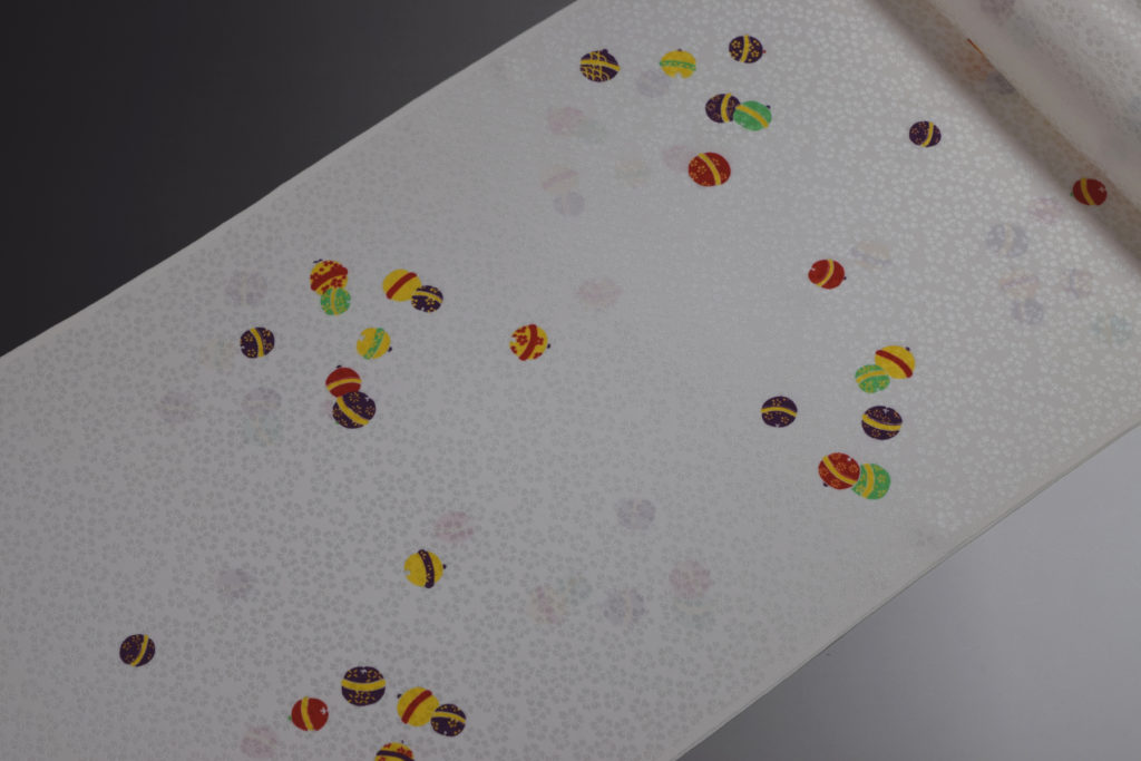 白地に、かわいい鈴文様。鈴は、その音により魔除けとなり、神事や祭祀に用いられて、のちには楽器として涼やかな音を楽しみ利用した。