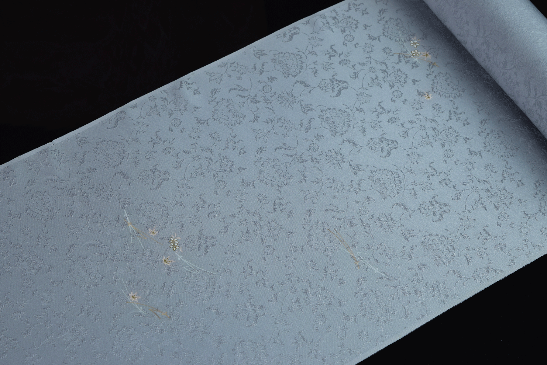 しっとりとした、シルバーグレイの地色にかわいらしいピンクの小花文様。柄の間隔を広くとった飛柄小紋。