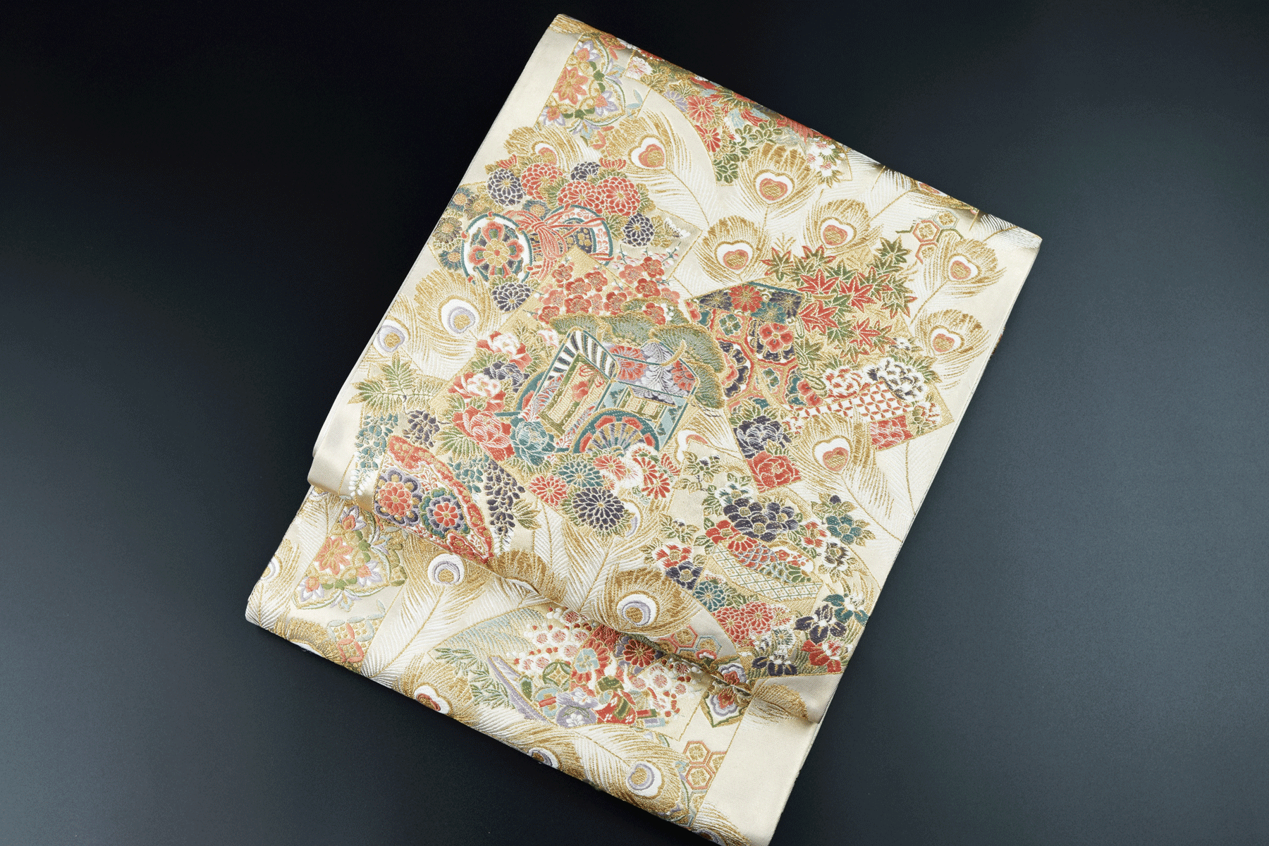 しなやかに織り上げられた帯地は、彩色糸を織り込んだ気品ある姿に仕上がっております。密に織り込まれた意匠の優雅さ、澄みわたる空気感、一幅の絵画のような美しさ。