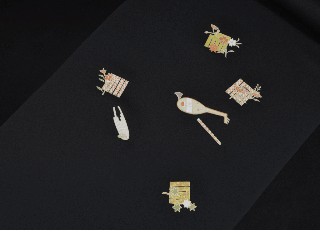 名古屋帯は、おしゃれに欠かせない用途の広い帯です。漆黒の地に源氏香文、草花文、琵琶、笙、横笛の楽器文。憧れの王朝文化の、象徴として表現された染帯。